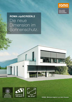 Der ROMA zipSCREEN.2 ist der textile Sonnenschutz der neuesten Generation. Als hochwirksamer Sonnenschutz vor dem Fenster spendet er Ihnen auf Knopfdruck weichen Schatten und bietet trotzdem transparenten Ausblick nach draußen. Auf Terrassen schützt Sie zipSCREEN.2 außerdem vor Zugluft und neugierigen Blicken.
